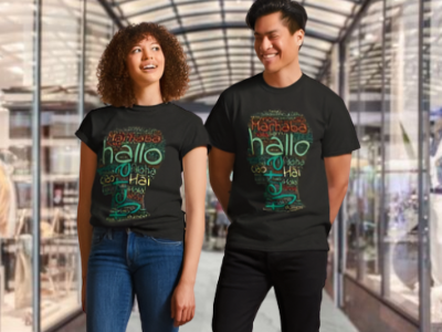 This design is a headshaped wordcloud made up of the word hello in different languages.